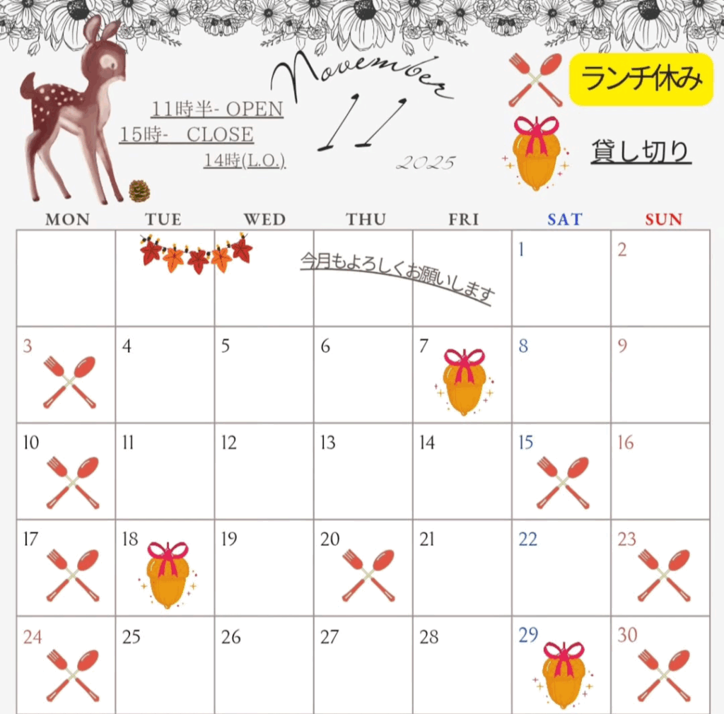 【レストランモクモク】11月のランチ営業日をご案内します。