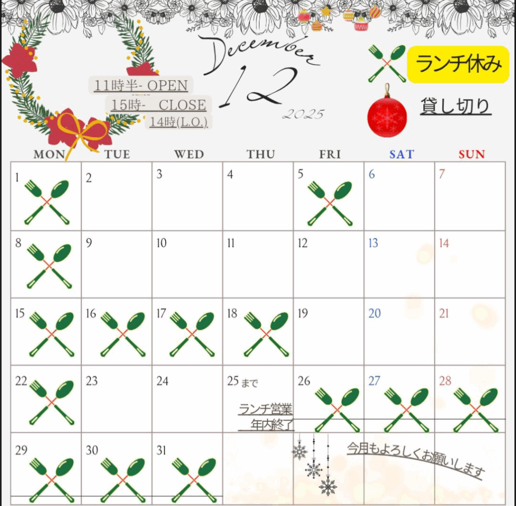 【レストランモクモク】12月のランチ営業日をご案内します。