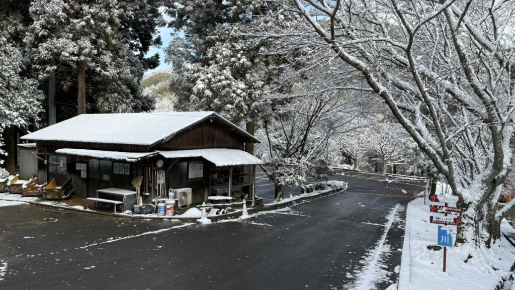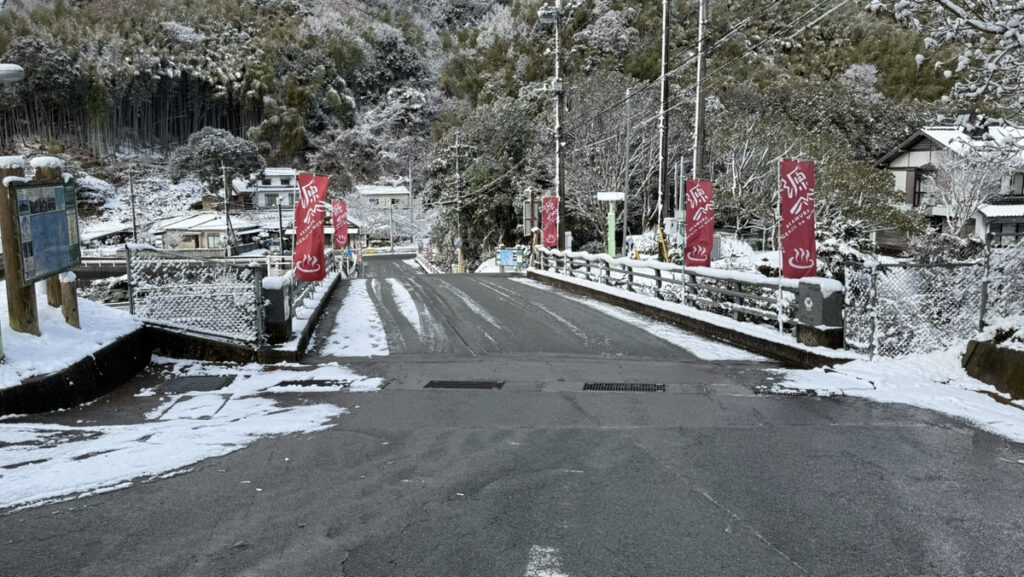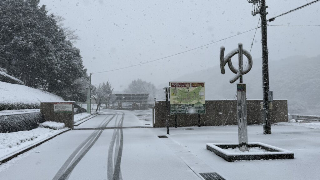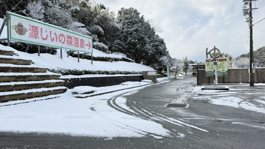 以下の写真は、9時30分時点での源じいの森温泉、正門前の路面状況の様子です。